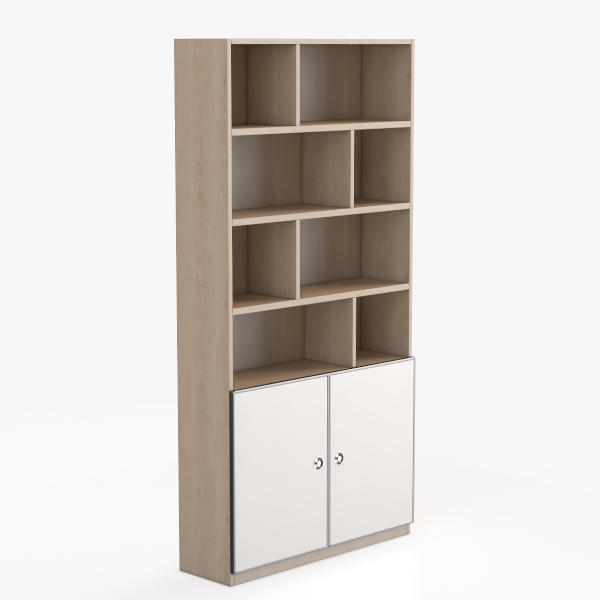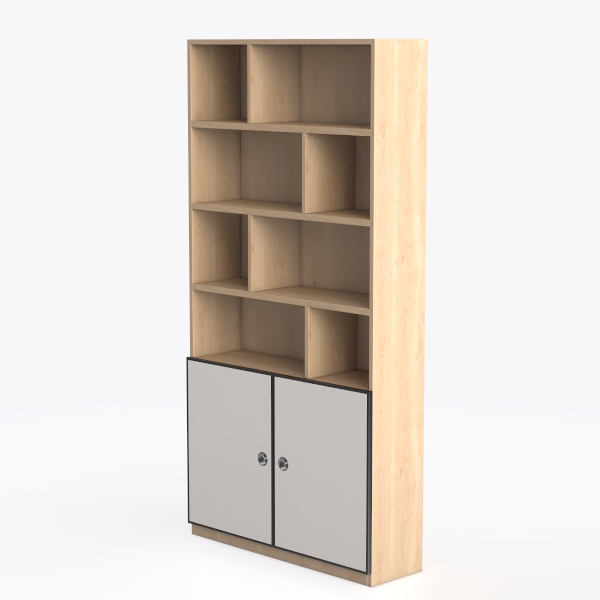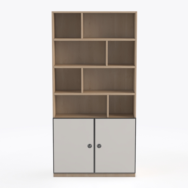Inspired by minimalist and functional design, this shelving unit blends natural wood tones with geometric structure. Its light oak frame offers a warm texture, while open shelves create a sense of spaciousness, and matte gray doors with black trims add modern contrast. Perfect for modern or Scandinavian living rooms/studies, it pairs well with marble accents and potted plants, with open shelves for display and closed cabinets for hidden storage.