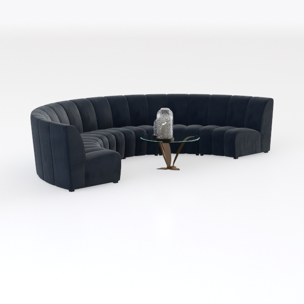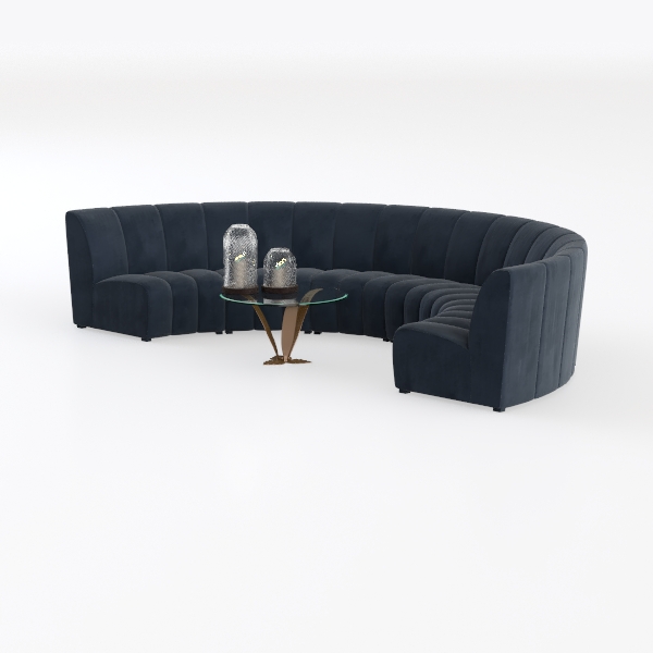 This elegant sofa merges mid-century modern warmth with contemporary sophistication, inspired by the organic fluidity of nature and the bold silhouettes of 1950s design. Its deep, rich navy upholstery feels sumptuously soft to the touch, with a subtle velvet-like texture that catches light gently, creating a sense of depth and luxury. The continuous curved silhouette flows gracefully, its rounded edges softening the space while the gentle channel tufting along the back adds refined detail, making it both visually striking and inviting.