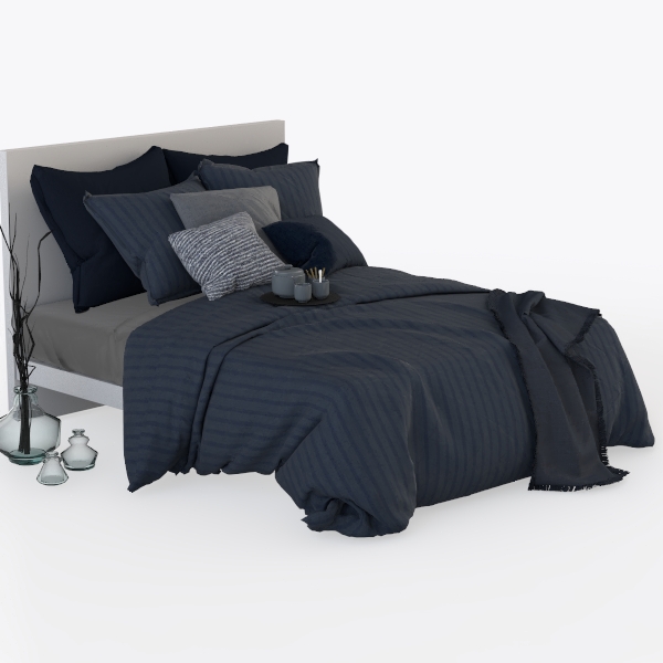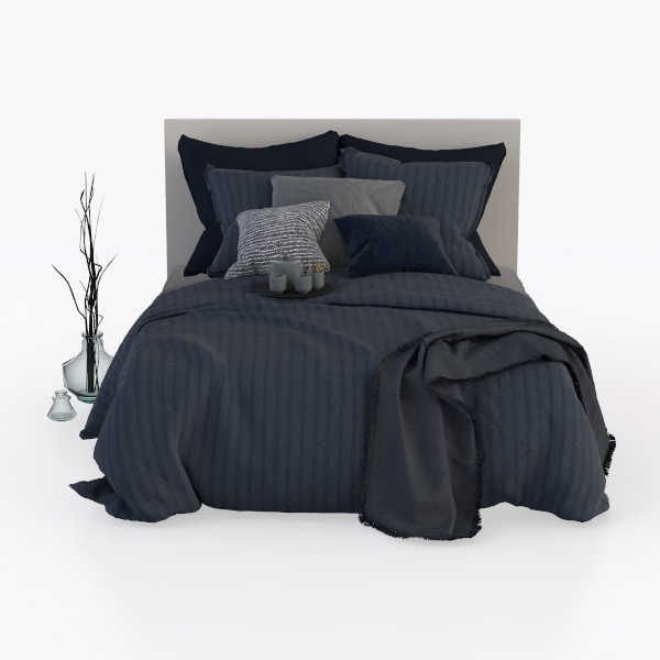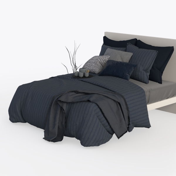 Inspired by the calm depth of midnight blue and minimalist Scandinavian design, this bed features soft, textural stripes creating a cohesive, serene look. Layers of varied throws and pillows add depth without clutter, while the plush, deep-set design offers exceptional comfort. Ideal for a modern minimalist bedroom, pairing seamlessly with wooden nightstands and soft ambient lighting.