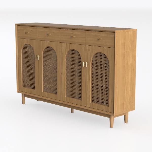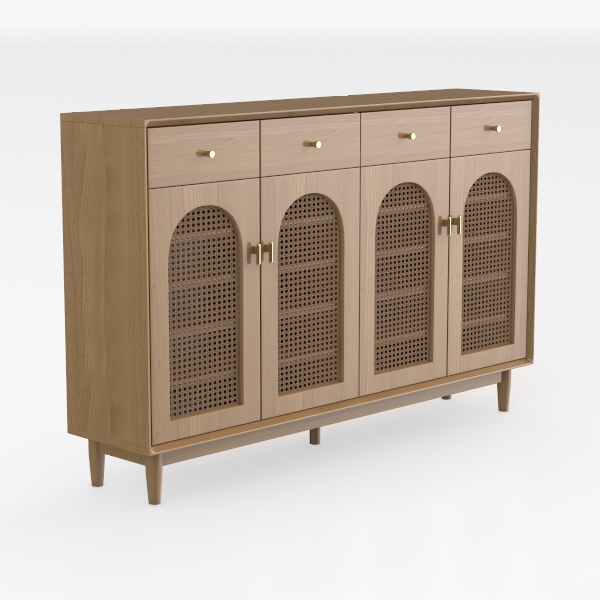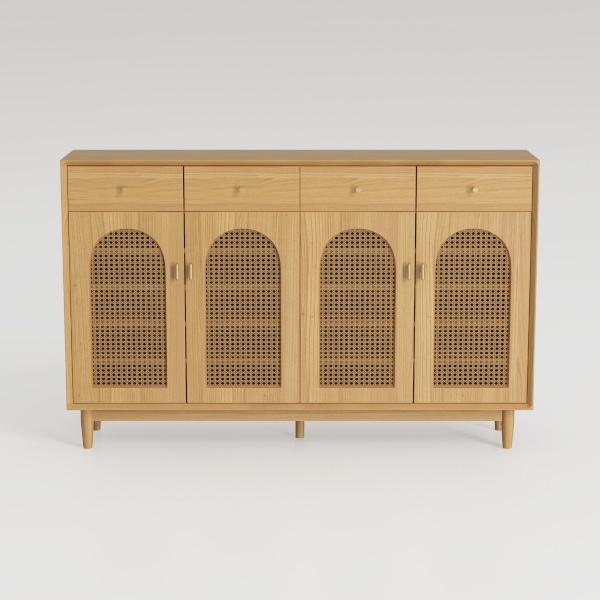 Designed with natural weaving artistry, this wooden cabinet blends warm oak grains and intricate rattan weaves, creating a textural harmony of warmth and lightness. Ideal for coastal, minimalist, or boho spaces, it pairs beautifully with linen sofas and potted greenery. Four drawers and doors offer ample storage, balancing style and practicality.