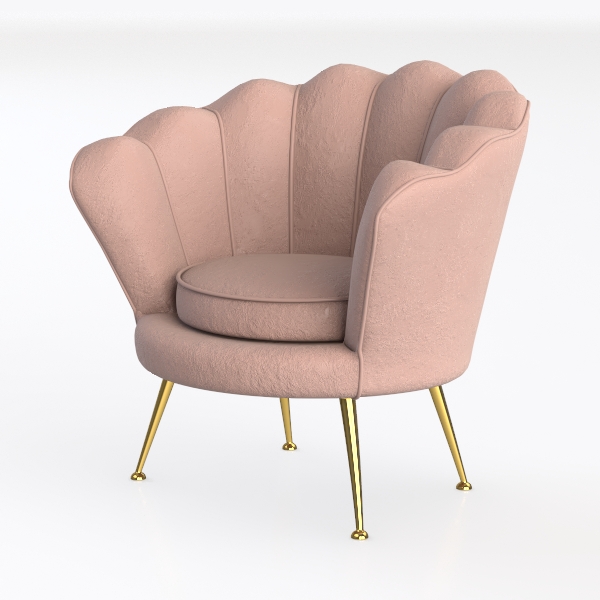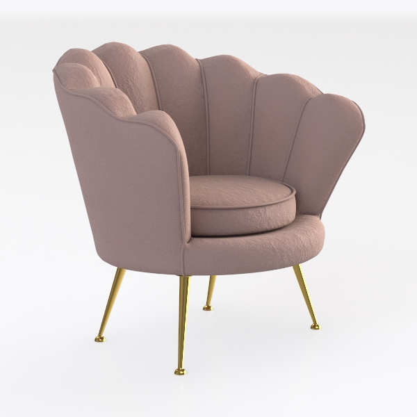 This elegant armchair takes cues from the serene, flowing forms of seashells, with its softly curved backrest and armrests mimicking the gentle unfurling of a shell. The chair’s plush, textured pink upholstery feels surprisingly warm to the touch, its softness inviting lingering moments of relaxation. Its rounded silhouette, free of sharp edges, creates a visually calming effect, while the delicate gold metal legs—slim and slightly flared—add a touch of understated luxury, balancing the chair’s softness with a hint of sophistication.
