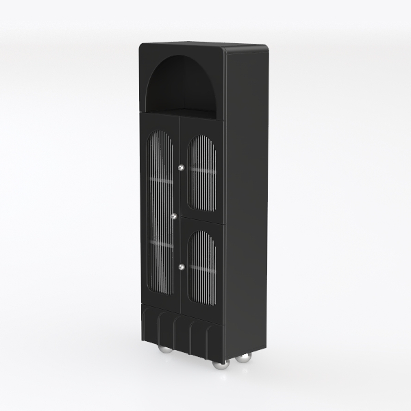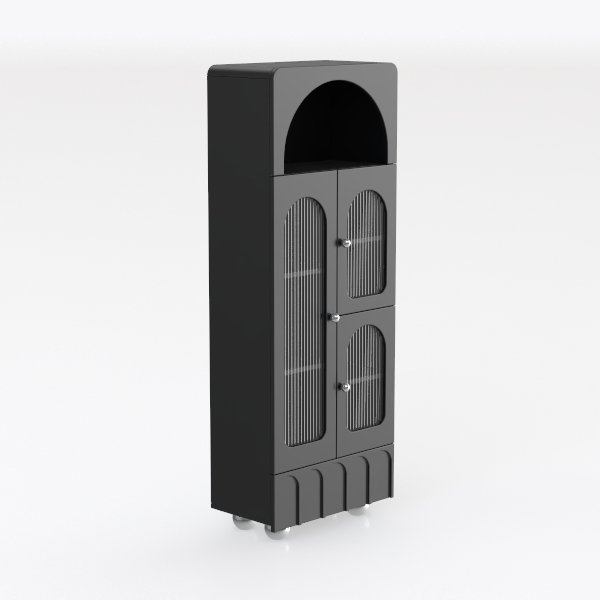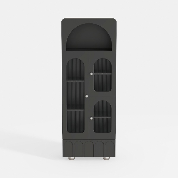 Drawing inspiration from mid-century architectural curves, this tall cabinet features a smooth matte black finish. Its curved top, vertical glass-paneled doors, and sleek metal knobs blend timeless elegance with modern minimalism. Perfect for a modern-retro living room or study, pair it with leather sofas and brass accents. Rolling casters ensure easy mobility, while internal shelves offer versatile storage for decor or daily essentials.