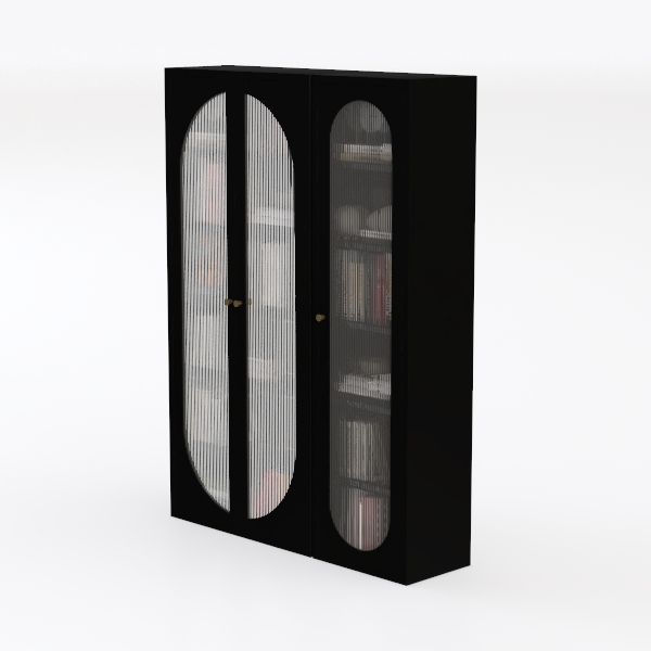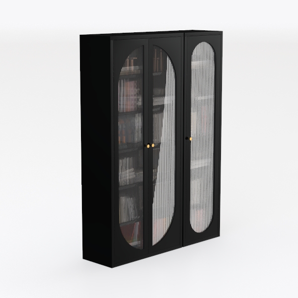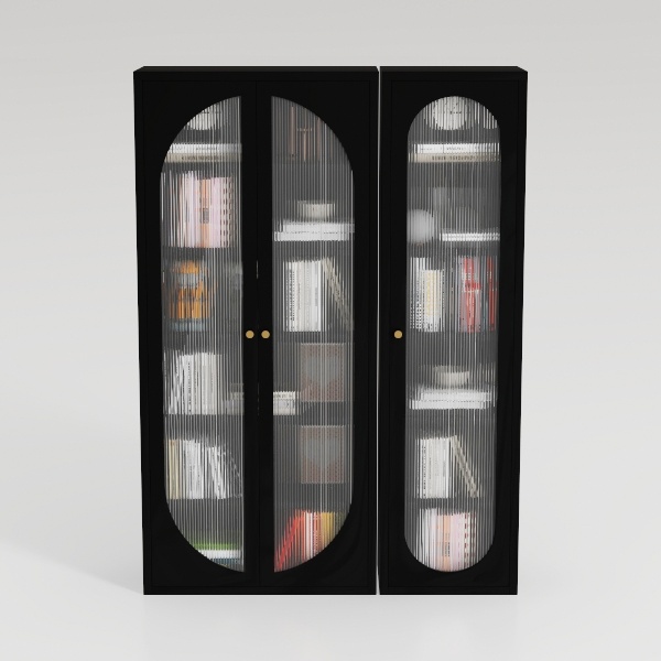 Inspired by mid-century architectural charm, this double-door cabinet features curved arch tops and a sleek matte black frame. Textured frosted glass doors add soft diffusion, while polished interior shelves reflect warm light, creating a balanced, airy visual. Perfect for minimalist or modern living rooms, it pairs beautifully with wooden accents and soft ambient lighting. Spacious adjustable shelves offer flexible storage for books, decor, and collectibles, blending style with practicality.