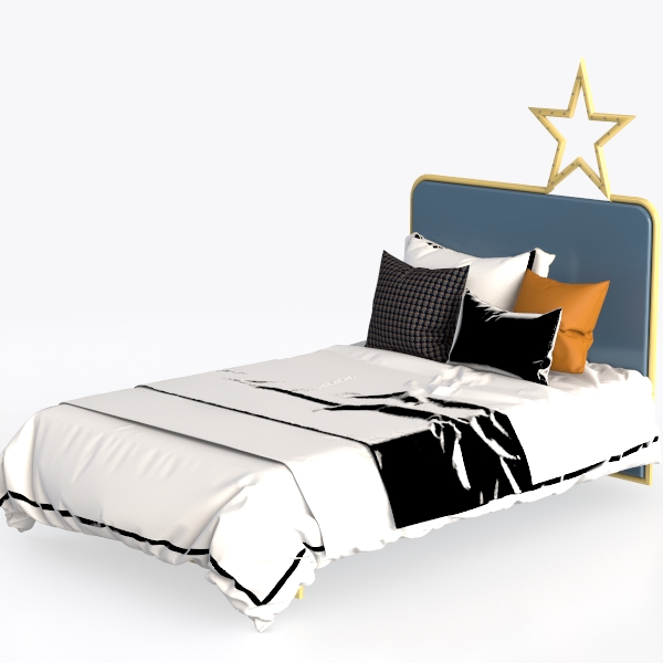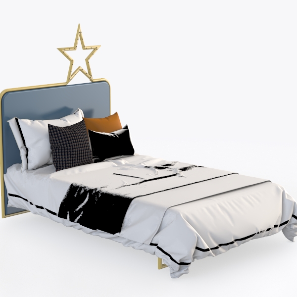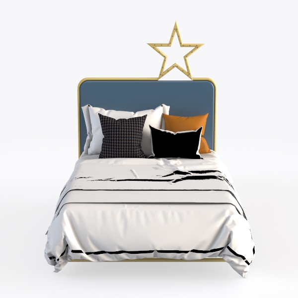 Inspired by celestial allure, this bed features a striking gold star detail atop a soft blue upholstered headboard with a sleek gold frame. The smooth, cool fabric of the headboard contrasts gently with the warm texture of the white, stripe-patterned bedding, creating a serene yet inviting look. Perfect for a modern minimalist bedroom, it pairs beautifully with wooden nightstands and metallic accents, while deep, padded headboard and plush bedding ensure exceptional comfort.