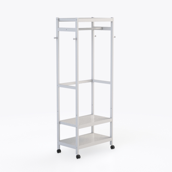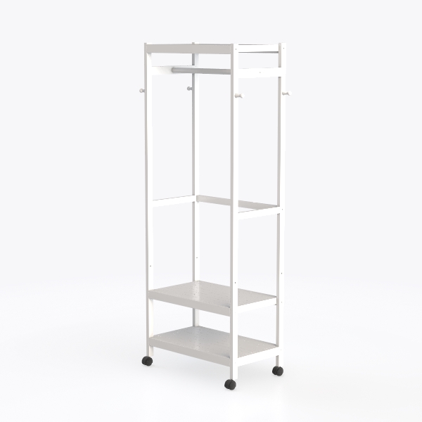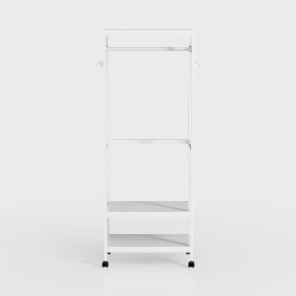 Inspired by minimalist and industrial aesthetics, this white organizer blends clean lines with practicality. Its bright, matte white finish and sleek metal frame create a light, airy look, while smooth-rolling wheels ensure easy mobility. Perfect for modern or Scandinavian entryways, bedrooms, or small closets, it features a top hanging rod for garments and open shelves below to neatly store folded items, balancing style and functionality.