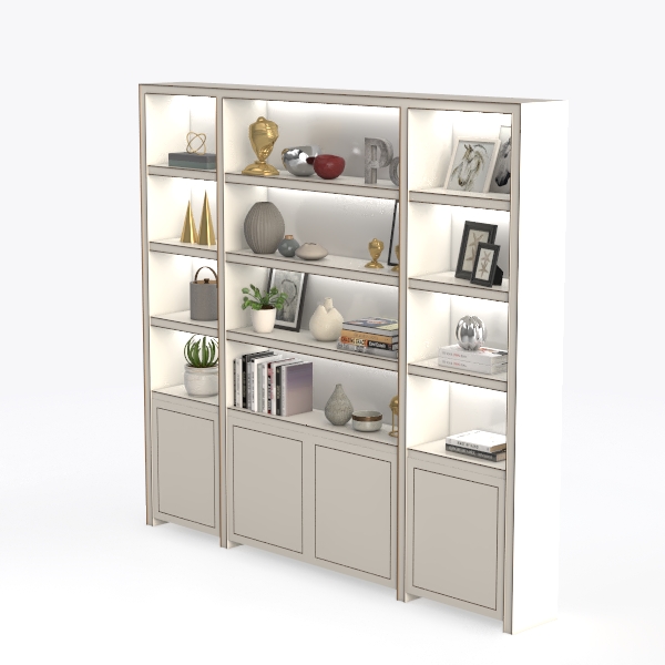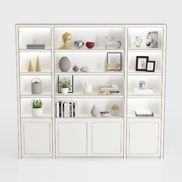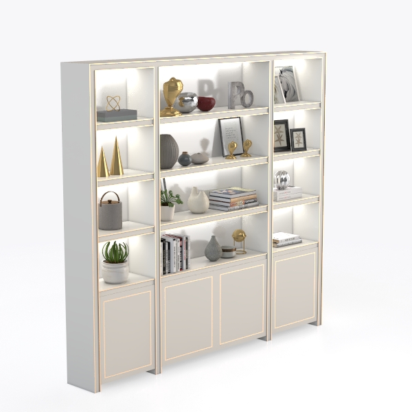 Inspired by balancing minimalism and functional display, this white shelving unit features a smooth, matte surface. Layered with metallic gold accents and potted greenery, it creates a bright, elegant visual. Ideal for modern or contemporary living rooms, blending marble and metal decor, while spacious compartments and closed cabinets offer ample storage and display.