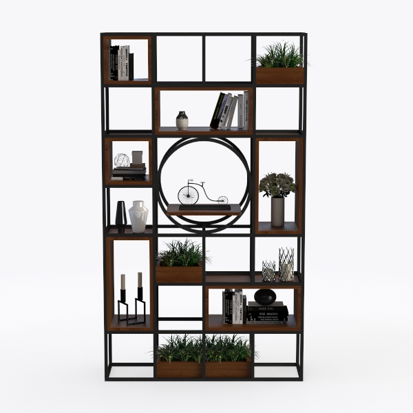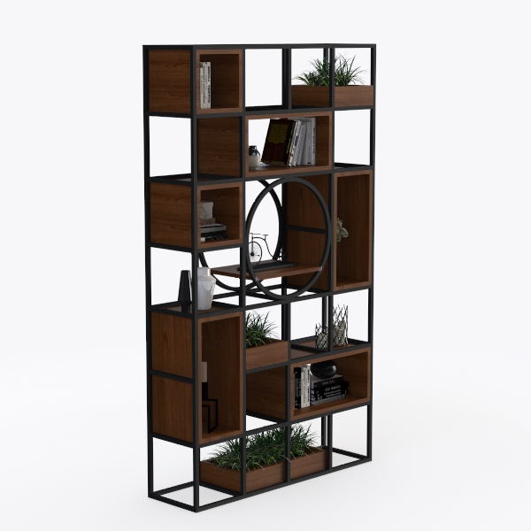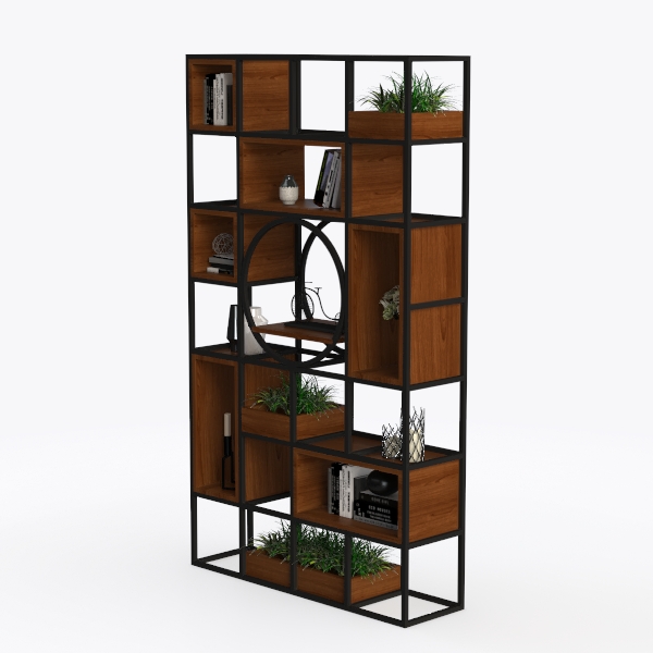 Drawing inspiration from traditional Chinese latticework, the shelving unit blends minimalist design with organic elements. Its black metal framework contrasts warmly with rich wooden shelves, offering a tactile mix of sleekness and warmth. Ideal for modern, Scandinavian, or mid-century living rooms, it pairs beautifully with marble accents and soft textiles. Spacious, varied compartments store books, plants, and decor, while the central circular cutout adds focal charm, balancing style and utility.
