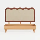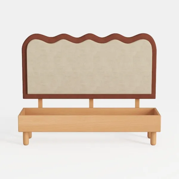 Inspired by gentle ocean waves, this headboard features soft beige upholstery with warm brown scalloped trim, paired with smooth light wood legs, creating a cozy, organic vibe. Ideal for a minimalist or Scandinavian bedroom, complementing linen bedding and potted greenery, while the spacious lower drawer offers hidden storage, blending style with practicality.