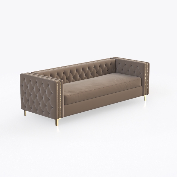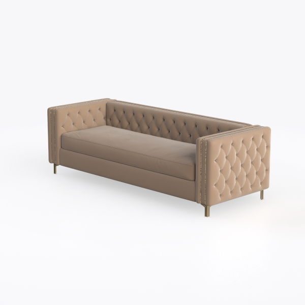 This elegant sofa blends mid-century modern charm with contemporary simplicity, drawing inspiration from the clean lines and refined details of classic furniture design. Its soft beige leather upholstery feels warm and inviting, while the tufted diamond pattern on the backrest adds subtle texture, creating depth without clutter. Vertical stitching along the armrests, accented with small metal studs, elevates its sophistication, and the slender gold metal legs ground the piece with understated luxury. Visually, it’s a study in balance—neutral tones make it versatile, yet intricate details ensure it stands out as a focal point.