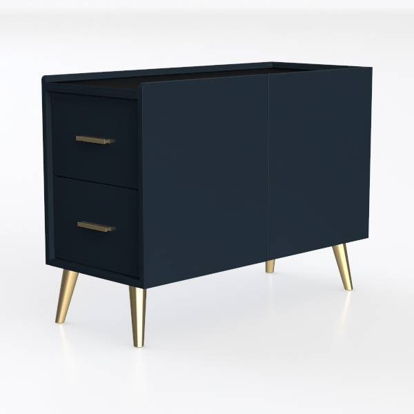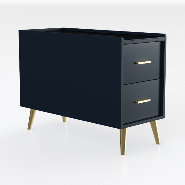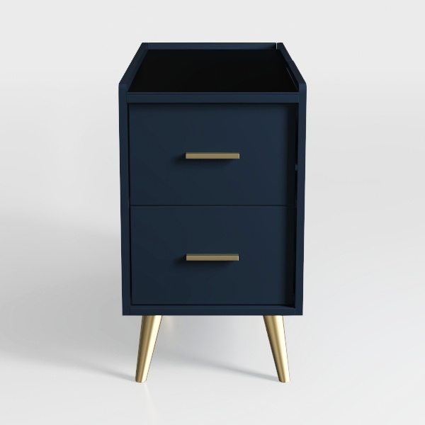 Inspired by mid-century modern design, this compact cabinet features a deep navy finish, smooth polished surface, and sleek gold handles that blend warmth and sophistication. Tapered gold legs elevate its look, ideal for modern, minimalist, or classic bedrooms. Two roomy drawers offer ample storage for nightly essentials, merging style and practicality effortlessly.