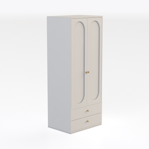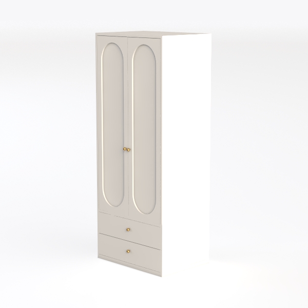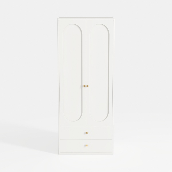 Inspired by a blend of classical simplicity and modern minimalism, this white wardrobe radiates clean, warm vibes with smooth matte surfaces. Sleek gold handles add subtle sophistication, creating a striking contrast against the soft white. Perfect for serene bedrooms, it pairs beautifully with neutral tones or soft pastels, enhancing both contemporary and vintage-inspired spaces. Two hanging doors and two drawers offer ample storage, blending functionality with elegant style for a practical, chic home addition.