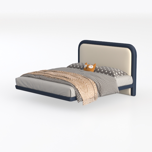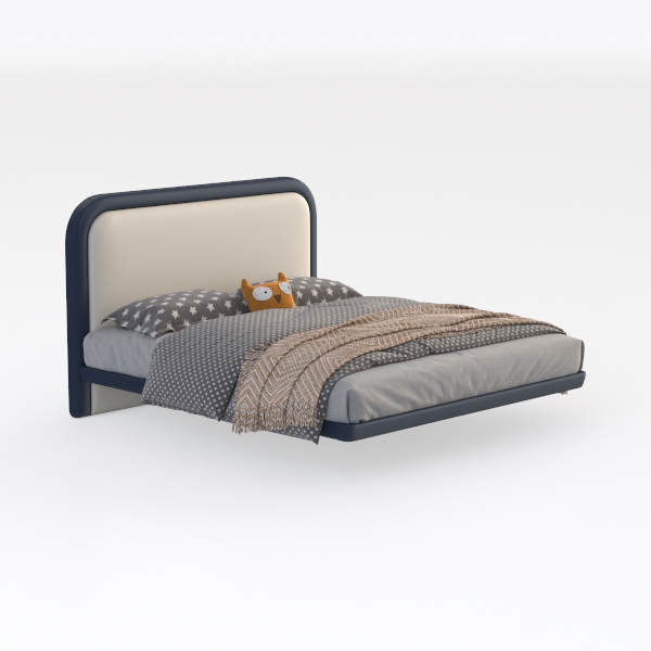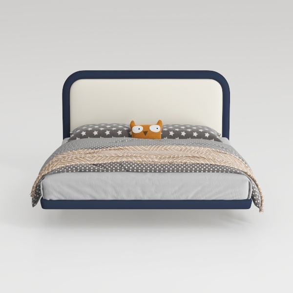 Inspired by soft geometric shapes and warm childhood memories, blending calm neutrals with playful details. The headboard has soft, creamy upholstery and a smooth navy frame; bedspread with star patterns and zigzag textures adds cozy warmth. Perfect for a modern kids' room or minimalist bedroom, pairing with wooden nightstands and soft fairy lights to enhance its inviting charm. Low-profile frame and ample space ensure relaxed sleep, neutral tones blending seamlessly with various decor styles.
