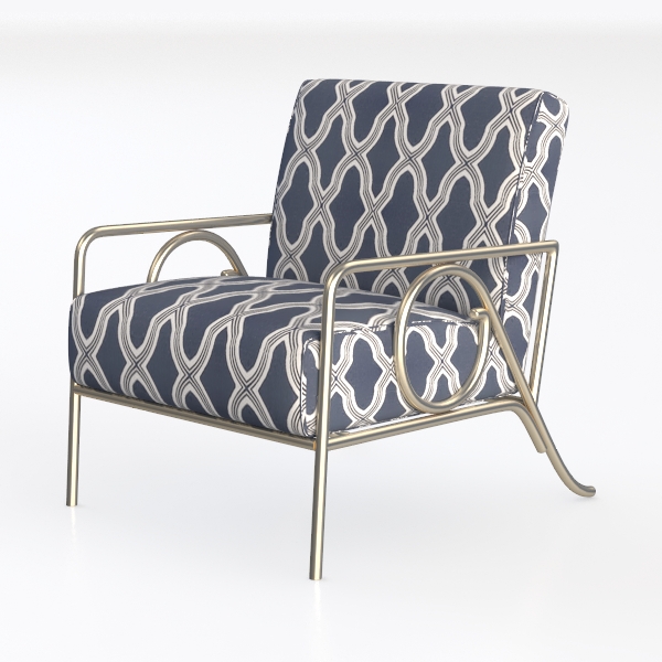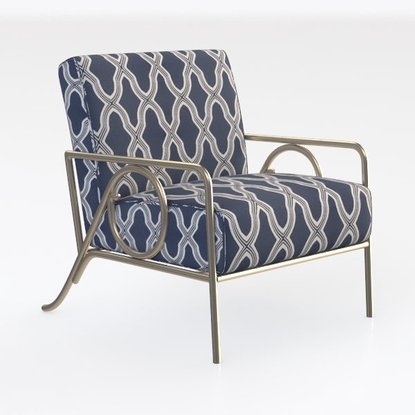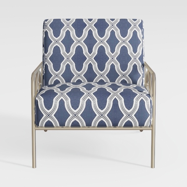 Inspired by mid-century geometric patterns, this armchair blends classic charm with modern minimalism. Its soft, textured upholstery in blue and white creates a cozy tactile feel, while the sleek gold-tone metal frame adds sophistication. Perfect for a contemporary living room, it pairs beautifully with marble side tables and warm wooden floors. The deep, well-padded seat offers excellent comfort, ideal for relaxing evenings.