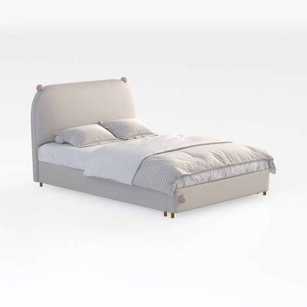 Inspired by soft, rounded minimalism, this bed blends gentle curves with subtle charm. Its plush, light gray upholstery feels smooth, while warm neutrals create a serene, airy vibe. Delicate pink accents on the headboard and golden legs add playful elegance, balancing simplicity with character. Perfect for modern or Scandinavian bedrooms, it pairs with linen bedding and soft lighting, enhancing a calm, cozy atmosphere. Sturdy golden legs support a spacious design, and the padded headboard offers gentle back support.