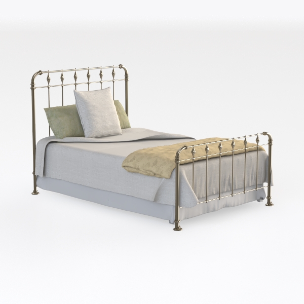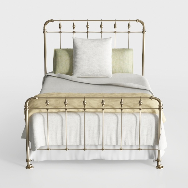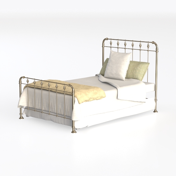 Inspired by vintage industrial craftsmanship, this bed features a warm, polished gold metal frame with delicate, geometric headboard and footboard. Its sleek lines and soft linen bedding create a blend of timeless elegance and cozy comfort. Perfect for modern or classic bedrooms, pair it with marble nightstands and velvet cushions. The sturdy frame ensures durability, while the sloped headboard offers gentle back support.