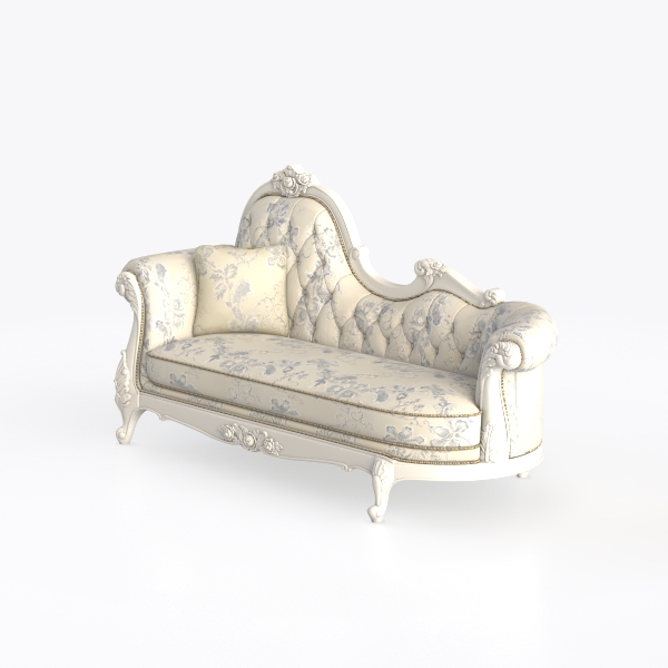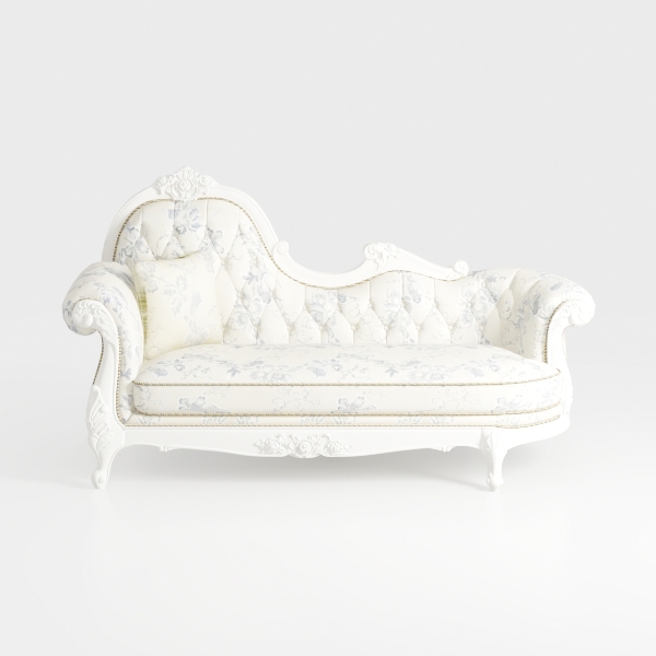 This elegant piece takes cues from 18th-century European classical design, blending time-honored craftsmanship with a soft, modern grace. Its frame, shaped with gentle curves and intricate floral carvings, whispers of refined romance, while the upholstery—adorned with a subtle gray floral pattern on a pristine white base—infuses the space with a warm, inviting glow.
