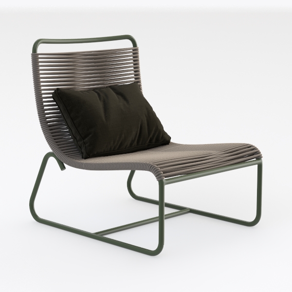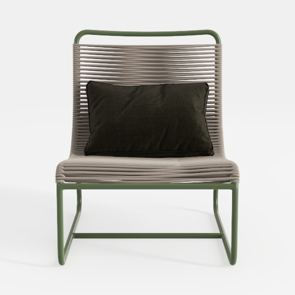 The frame, crafted from a muted sage green material, exudes a subtle metallic sheen that catches light gently, while the woven seat and backrest—made from a textured, light gray fabric—offer a satisfyingly firm yet yielding feel under the hands. A plush, deep green cushion rests at its center, its smooth, velvety texture inviting close contact. Together, the muted green frame and neutral weave create a balanced, earthy palette that feels calm and grounding, with no clutter to distract from its streamlined silhouette—light enough to move easily, yet substantial enough to feel stable.