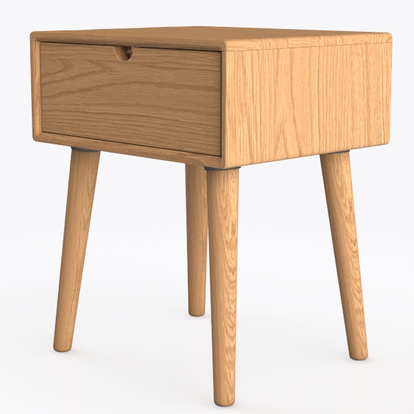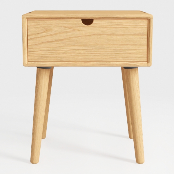 Inspired by Scandinavian minimalism, it merges organic warmth with clean lines. Crafted from smooth oak, its warm grain and soft matte finish create a tactile, calming visual. Ideal for a cozy minimalist bedroom, pair with linen bedding and ceramic lamps for serenity. A spacious drawer holds nightly essentials, while sturdy tapered legs ensure stability, blending function with timeless elegance.