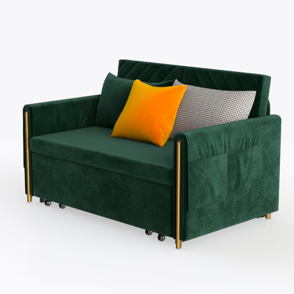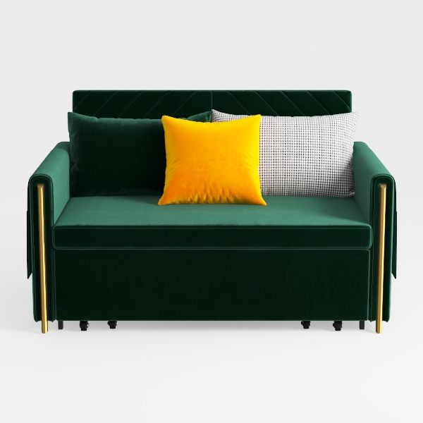 This home furnishing piece radiates a harmonious mix of retro warmth and contemporary chic, taking cues from mid-century modern design reimagined for modern living. Its sumptuous deep emerald upholstery—textured like soft velvet—feels incredibly tactile, offering a comforting, cloud-like embrace, while the subtle sheen of the fabric catches light gently, infusing the space with quiet luxury. Golden metal armrests, with their clean, angular lines, add a polished contrast, elevating the sofa from simple to statement-worthy without overwhelming the eye.
