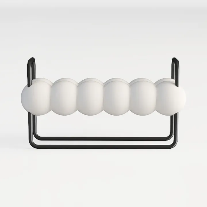 Crafted from organic-inspired curves, this piece blends soft, matte white forms with sleek black metal. Smooth to the touch, the spherical elements create a gentle, tactile contrast to the angular base, evoking a calm, minimalist vibe. Ideal for modern or Scandinavian living spaces, it pairs beautifully with light wood accents and neutral decor, offering subtle support while adding visual lightness.