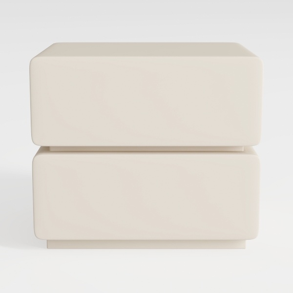 Inspired by minimalist geometry, this sleek two-drawer nightstand features a soft off-white finish with a smooth, matte texture that catches light gently. Its clean lines and compact form blend seamlessly into modern, Scandinavian, or contemporary bedrooms, pairing beautifully with wooden beds and warm ambient lighting. The dual drawers offer practical storage for bedtime essentials, sliding smoothly to reveal organized space without overwhelming the room’s calm aesthetic.