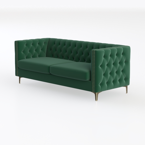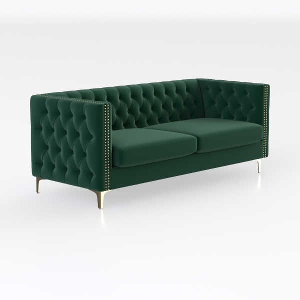 Inspired by the timeless allure of mid-century modern design, this sofa blends retro sophistication with contemporary comfort, creating a piece that feels both nostalgic and fresh. Its deep emerald green upholstery, rendered in a soft, plush fabric, invites gentle touches—each caress revealing a texture that balances smoothness with subtle depth. The meticulously tufted backrest and seat cushions form a rhythmic, diamond-patterned design, catching light to add dimension, while polished gold nailhead trim along the armrests and sides elevates the look with refined sparkle. Slender, tapering gold legs ground the sofa in a sleek, uncluttered silhouette, enhancing its airy, luxurious feel.