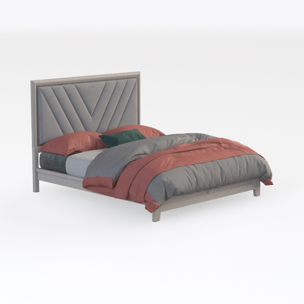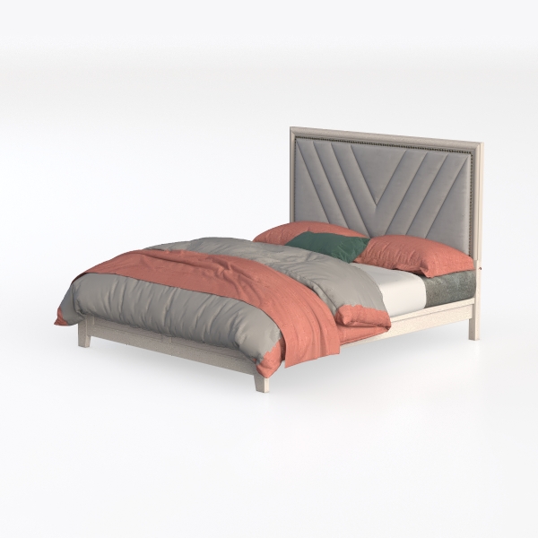 Inspired by classic geometric patterns, this vintage-inspired bed features a soft tufted gray headboard with subtle metallic framing. Textured linen-like coral and gray bedding, paired with a white wooden frame, create a serene, sophisticated look. Ideal for a master bedroom, blending modern minimalism with timeless charm, it pairs beautifully with wooden nightstands and warm walls. The spacious frame offers ample room, while the tufted headboard provides gentle support for restful nights.