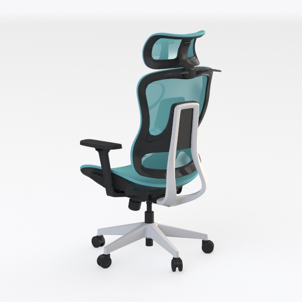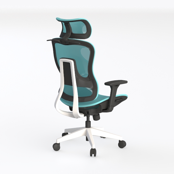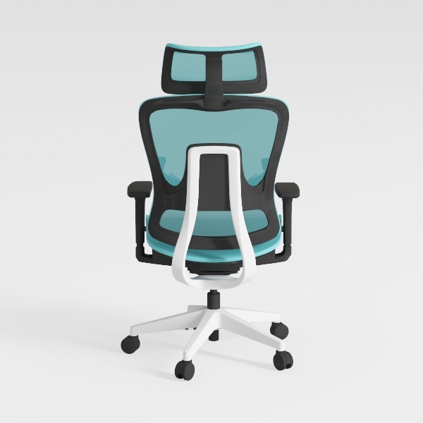 Designed with ergonomic principles to prioritize comfort during long hours, this chair features a mesh backrest that offers a lightweight, breathable feel. Sleek black and teal upholstery adds modern vibrancy, complemented by clean white armrests and a sturdy white base with smooth-rolling wheels. Perfect for a contemporary home office, it pairs beautifully with wooden desks and understated lamps, while adjustable headrest and armrests ensure personalized support for focused work.