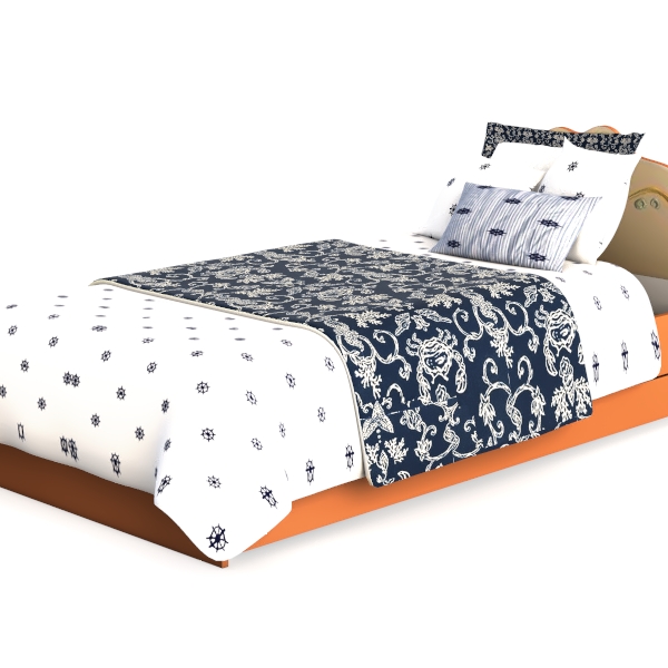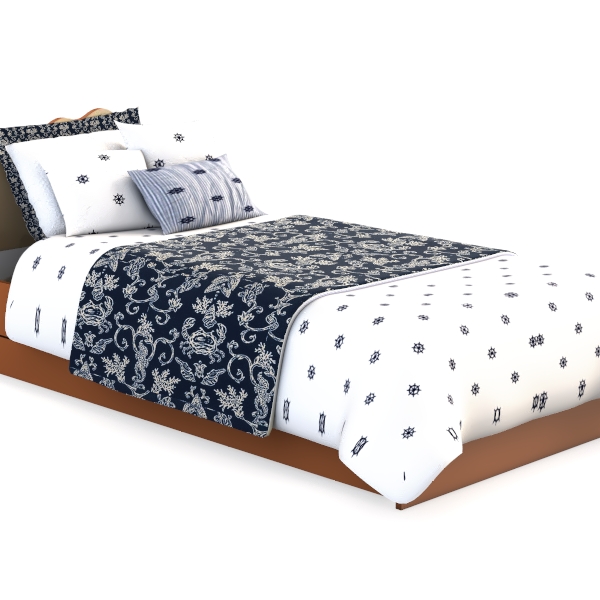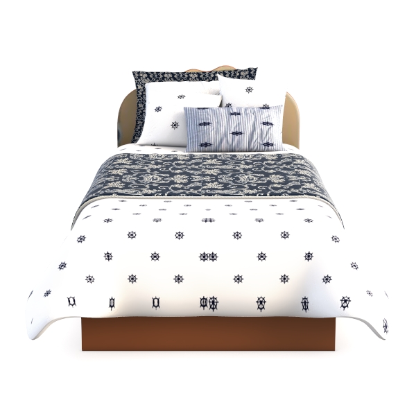 Designed with coastal nautical inspiration, the bed features intricate navy and white patterns that evoke a serene maritime vibe. Soft, textured fabrics create a tactile delight, while crisp lines and a light color palette offer a fresh, airy visual feel. Perfect for a modern coastal or Scandinavian bedroom, it pairs beautifully with wooden nightstands and white linen curtains. A sturdy wooden frame ensures durability, and the deep headboard provides cozy back support for relaxing moments.