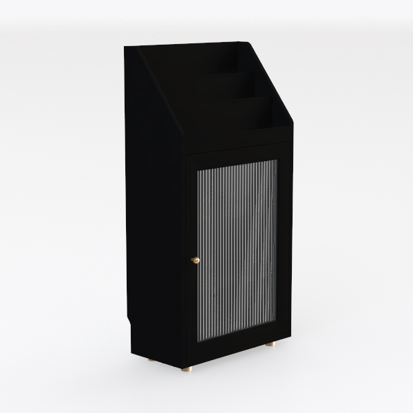 Inspired by minimalist modern design, this black cabinet blends three open upper shelves with a lower glass-fronted compartment featuring vertical stripes. Its matte surface and gold accents (handle, feet) create a sleek, luxurious look, while the glass door adds subtle transparency. Ideal for modern living rooms or studies, it offers both open and closed storage, perfect with wooden or metal furniture.