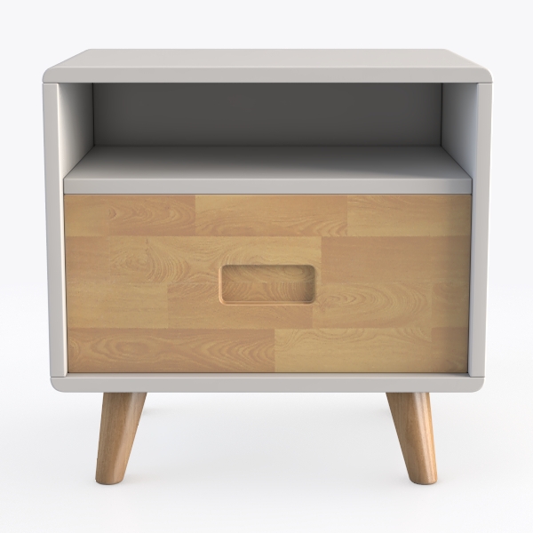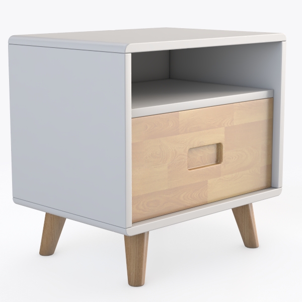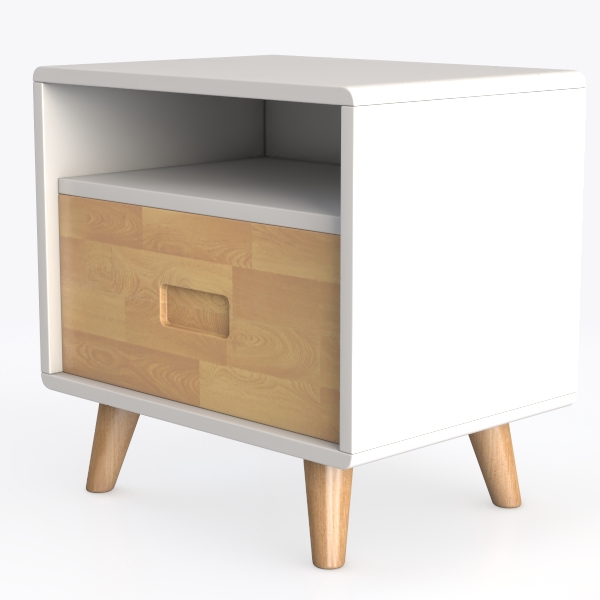 Inspired by organic textures and minimalist Scandinavian design, this bedside table blends warm, light wood grain on the drawer with a smooth white top, creating a calm, tactile balance. Ideal for a serene bedroom, it pairs beautifully with a brass lamp and small potted plant, enhancing modern minimalist or mid-century vibes. A single drawer with a subtle handle offers practical storage, while slanted wooden legs add playful charm.