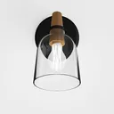 A 3D model of a Wall Lamp, featuring transparent glass shade, wooden lamp post, and black metal base and a modern minimalist with natural-industrial aesthetic. It has low polygon design and is suitable for interior decoration like bedrooms or hallways.