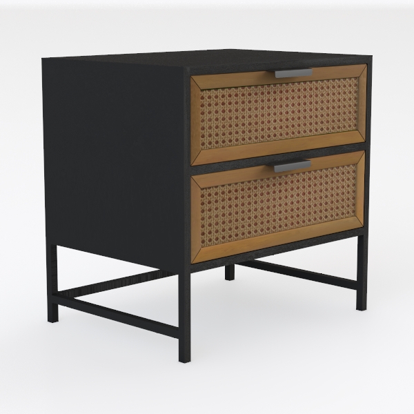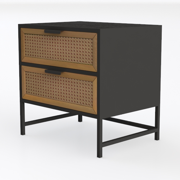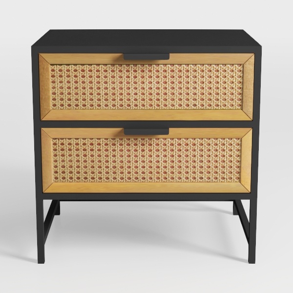 Drawing inspiration from natural craftsmanship, this bedside piece blends warm woven rattan front with a matte black metal frame, adding texture and organic charm. Its smooth handles and two spacious drawers offer practical storage, easy to access. Ideal for modern, coastal, or Scandinavian bedrooms, pairing beautifully with wooden beds and minimalist lamps to elevate your space.