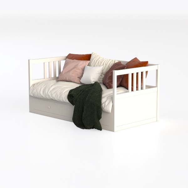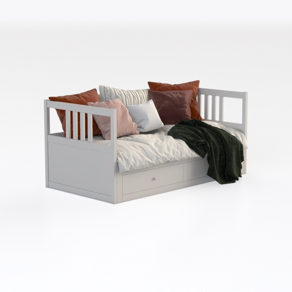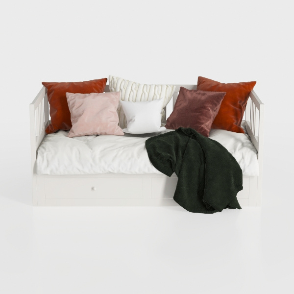 Inspired by Scandinavian minimalism, this daybed features a sleek white frame with roomy drawers, blending simplicity and practicality. Soft velvet pillows in rust, blush, and cream, plus a cozy knit throw, add warm texture and visual depth. Ideal for a serene bedroom, pairing beautifully with light wood furniture and linen curtains, its plush mattress ensures both style and comfort.