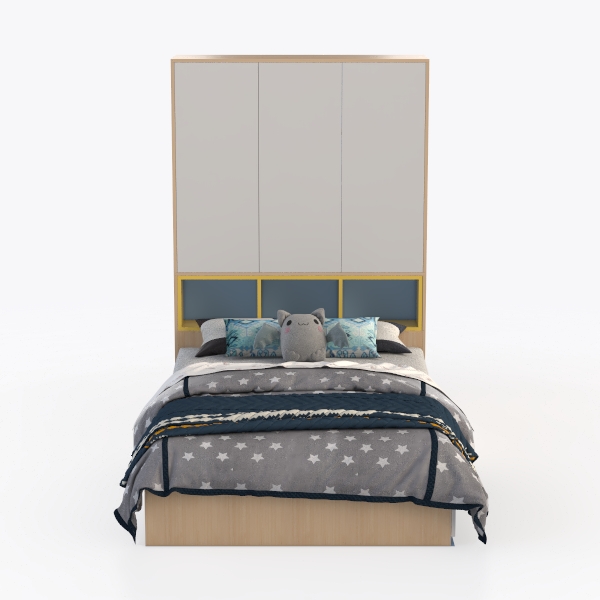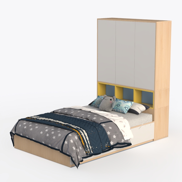 Inspired by minimalist design, this bedroom furniture blends practicality and warmth. A smooth, matte gray headboard with subtle texture contrasts soft yellow accents, while light wooden tones add a natural touch. Ideal for modern Scandinavian or kids' rooms, it features a built-in wardrobe in the headboard to save space, with cozy star-patterned bedding and plush toys enhancing comfort.