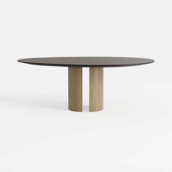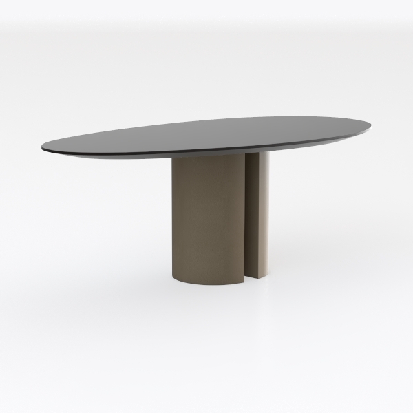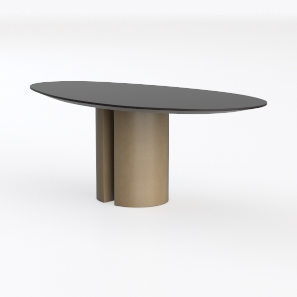 Inspired by architectural minimalism, blending geometric precision with organic flow, this table features a sleek, matte black top and warm, textured gold legs, balancing light/shadow for a sophisticated, uncluttered look. Ideal for modern minimalist dining/living rooms, pairing marble accents and linen, its oval shape maximizes space, sturdy column legs ensure stability, perfect for family meals or gatherings.