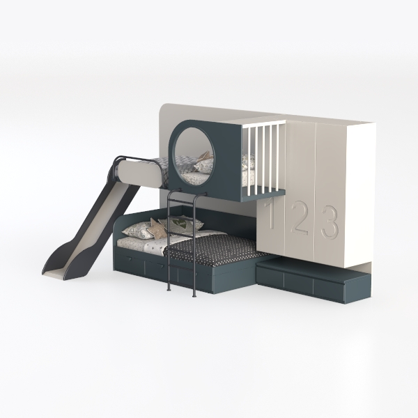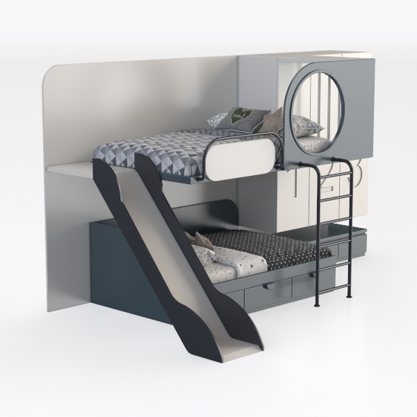 Designed with playful childhood imagination, this bunk bed blends sleek, smooth surfaces in soft grays and whites, accented with deep blue. A circular window adds whimsy, while a slide and integrated drawers combine fun, storage, and space-saving, perfect for a kid’s room in minimalist or Scandi styles.