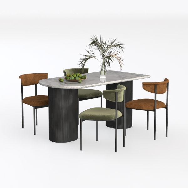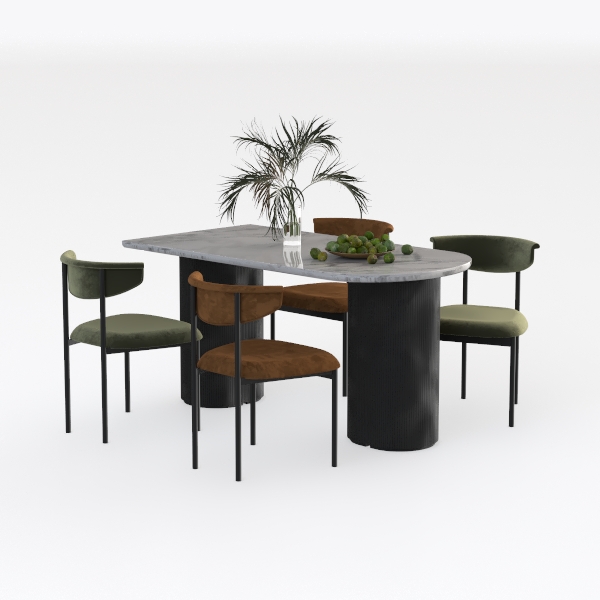Drawing from nature and modern minimalism, this table blends a smooth marble top, soft velvet seats in green and brown, and slender black legs. Its sleek, warm aesthetic works beautifully in minimalist dining spaces, paired with potted plants and soft lighting. Padded chairs offer comfort, while the sturdy base ensures stability for everyday use.