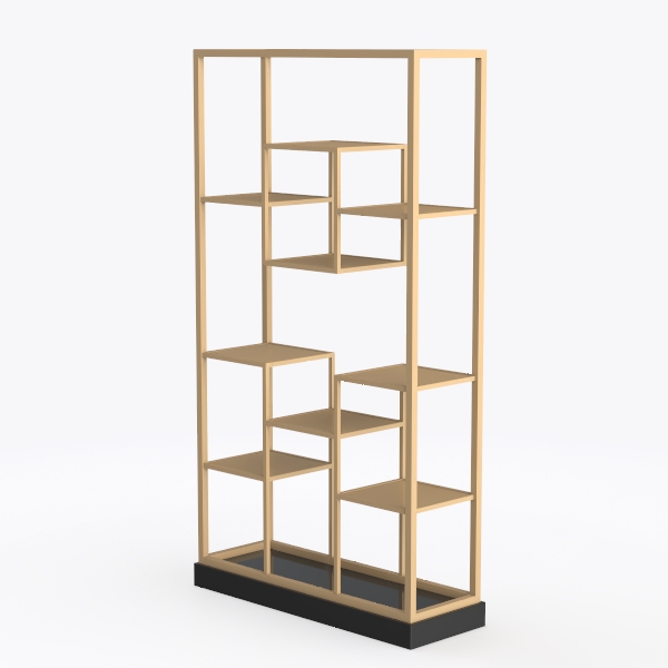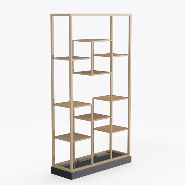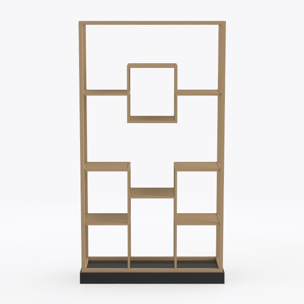 Blending geometric minimalism with subtle traditional charm, this piece features a sleek golden frame and a grounded black base. The polished metal texture and layered compartments create a light yet structured visual rhythm. Ideal for modern, Scandinavian, or minimalist spaces, it pairs beautifully with marble accents and potted plants, offering flexible display space for books, decor, or small greenery, balancing function and style.