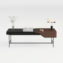 Inspired by the blend of natural textures and geometric elegance, this piece features smooth black surfaces and soft brown leather extensions. Its sleek lines and contrasting materials create a minimalist yet warm atmosphere. Ideal for modern, minimalist, or contemporary studies, pair with metallic lamps and potted plants to enhance depth. The spacious top and extended leather area offer ample space, while slim metal legs ensure stability, balancing style and functionality perfectly.