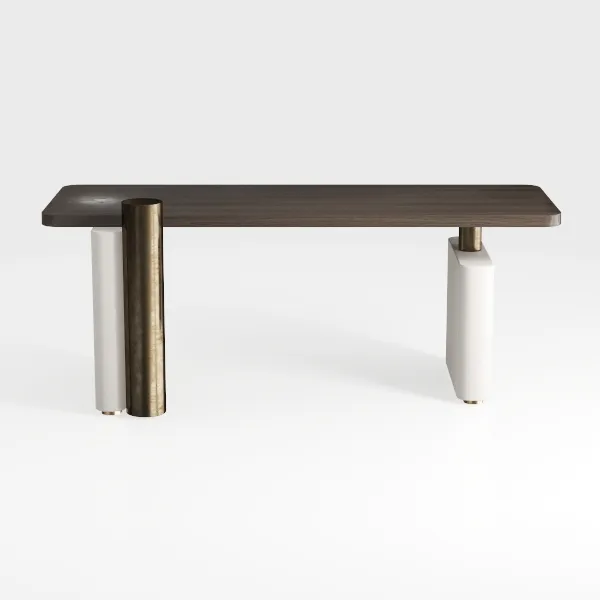Inspired by mid-century modern minimalism and geometric balance, this piece blends warm dark wood with sleek metallic and matte white legs. The smooth, textured top contrasts beautifully with structured bases, creating a sophisticated, balanced vibe. Ideal for minimalist or contemporary living rooms, pair with marble accents and soft lighting to elevate the look. Its sturdy design ensures stability, with a spacious surface perfect for daily use or decor.