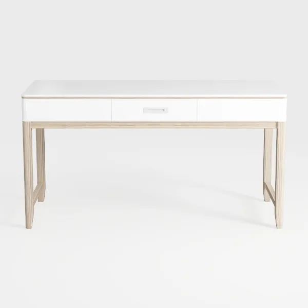Beyond its aesthetic, the desk prioritizes practicality: a central drawer offers hidden storage for stationery, while the spacious top easily accommodates a laptop, notebooks, and decorative items without clutter. Its slender, tapering legs not only enhance stability but also free up floor space, making it ideal for compact rooms. Overall, it balances form and function, inviting focus and calm into any workspace.