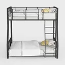 Designed for space optimization, this bunk bed features a sleek black metal frame blending modern minimalism with industrial edge. Its smooth surface contrasts crisp white linens, creating a clean, airy look. Ideal for family bedrooms or dorms, it pairs with wooden nightstands and soft rugs, enhancing cozy, functional living. Sturdy ladder and roomy under-bed space maximize utility, balanced frame ensuring stability and comfort.