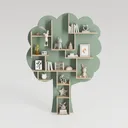Inspired by nature, this tree-shaped shelf features a soft sage green backboard and light wood shelves, with warm, tactile surfaces and organic curves. Filled with playful decor like stuffed animals, potted plants, and framed art, it blends Scandinavian and whimsical styles, ideal for a cozy kids' room or family space. Multiple staggered shelves offer ample storage for books, toys, and knick-knacks, adding both charm and practicality.