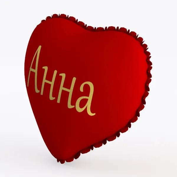 A 3D model of a heart-shaped pillow, featuring red fabric, gold "Анна" text, and fringed edges, with a romantic decorative aesthetic. It has a low polygon count, suitable for home decoration or as a personalized gift.