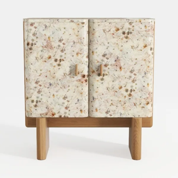Inspired by natural stone textures, this cabinet features a marbled surface with soft earthy tones, exuding warmth and elegance. Its smooth oak legs add stability, while the subtle pattern creates visual interest. Ideal for modern minimalist or Scandinavian spaces, it pairs well with light sofas and wooden tables, offering spacious storage behind its two doors for daily essentials.