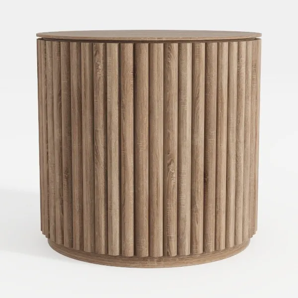 Crafted with natural inspiration from tree bark textures and classic columnar designs, this circular side table features light wood with smooth vertical ridges. Its warm, tactile surface has subtle grain details, blending modern minimalism with organic charm. Ideal for modern, Scandinavian, or minimalist spaces—perfect as a living room or bedroom side table, saving space while supporting small essentials like lamps or decor.