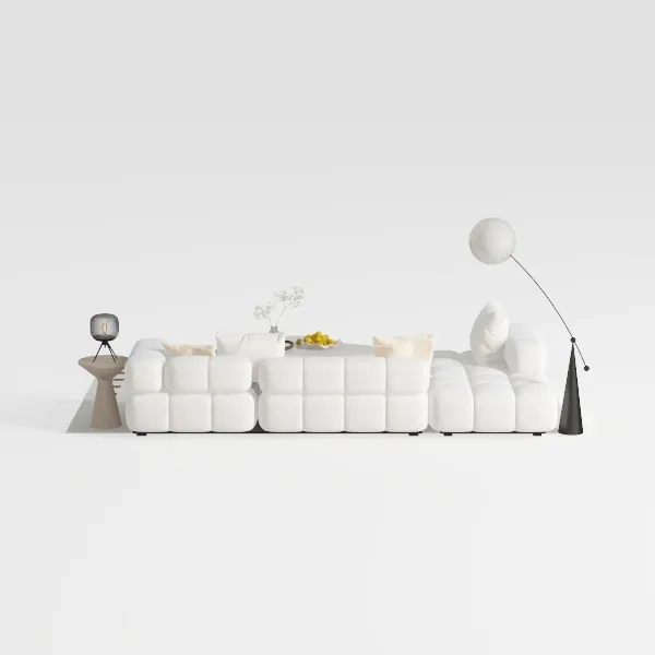 Ideal for a chic, modern lounge or an upscale family room, this sofa pairs effortlessly with a sleek marble coffee table and elegant metallic accents, such as a unique arc floor lamp. Its bright white fabric not only enhances the lightness of the room but also serves as a canvas for colorful decor and personal touches.