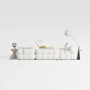 This sofa draws inspiration from organic, flowing forms—think smooth river stones or the curved lines of mid-century modern architecture—blending softness with structural elegance. Crafted from a plush bouclé fabric in a crisp white hue, it feels surprisingly warm to the touch, with subtle textural depth that catches light gently. Its rounded armrests and softly indented backrest create a silhouette that’s both contemporary and inviting, balancing minimalist simplicity with a hint of sculptural charm.