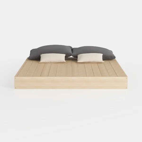 This minimalist bed features a low wooden platform base with two pillows, perfect for contemporary bedrooms, containing 245649 polygons.